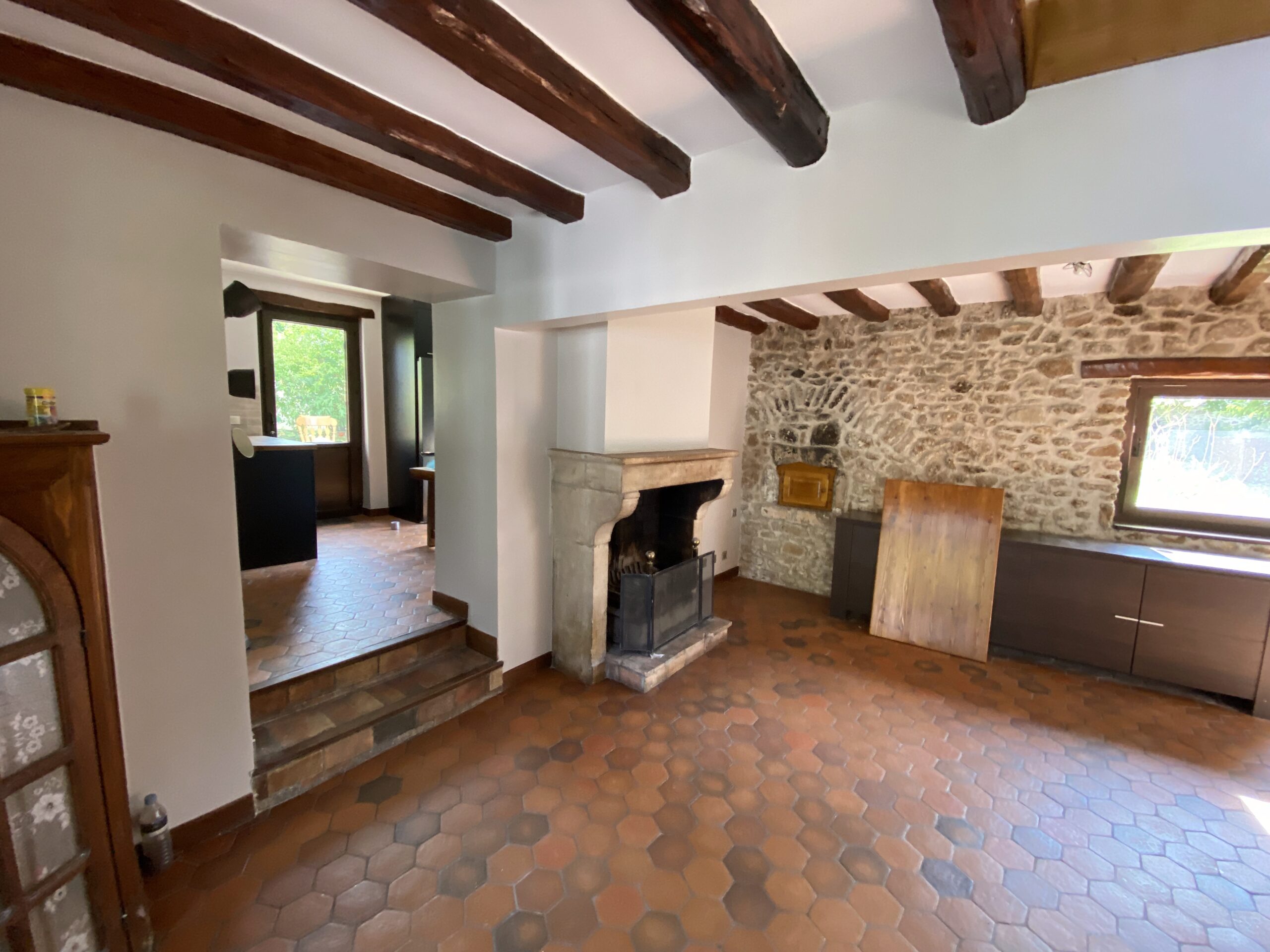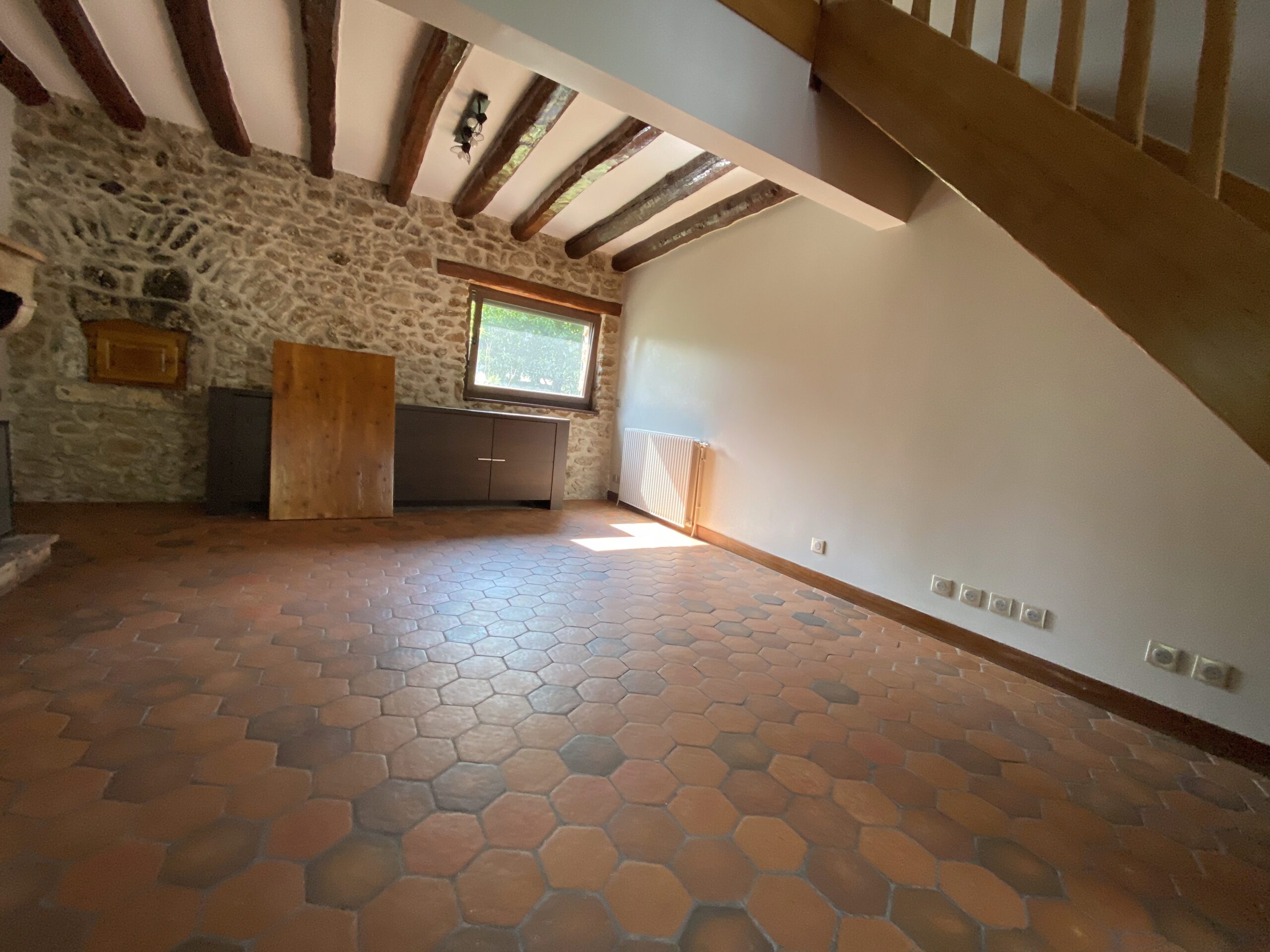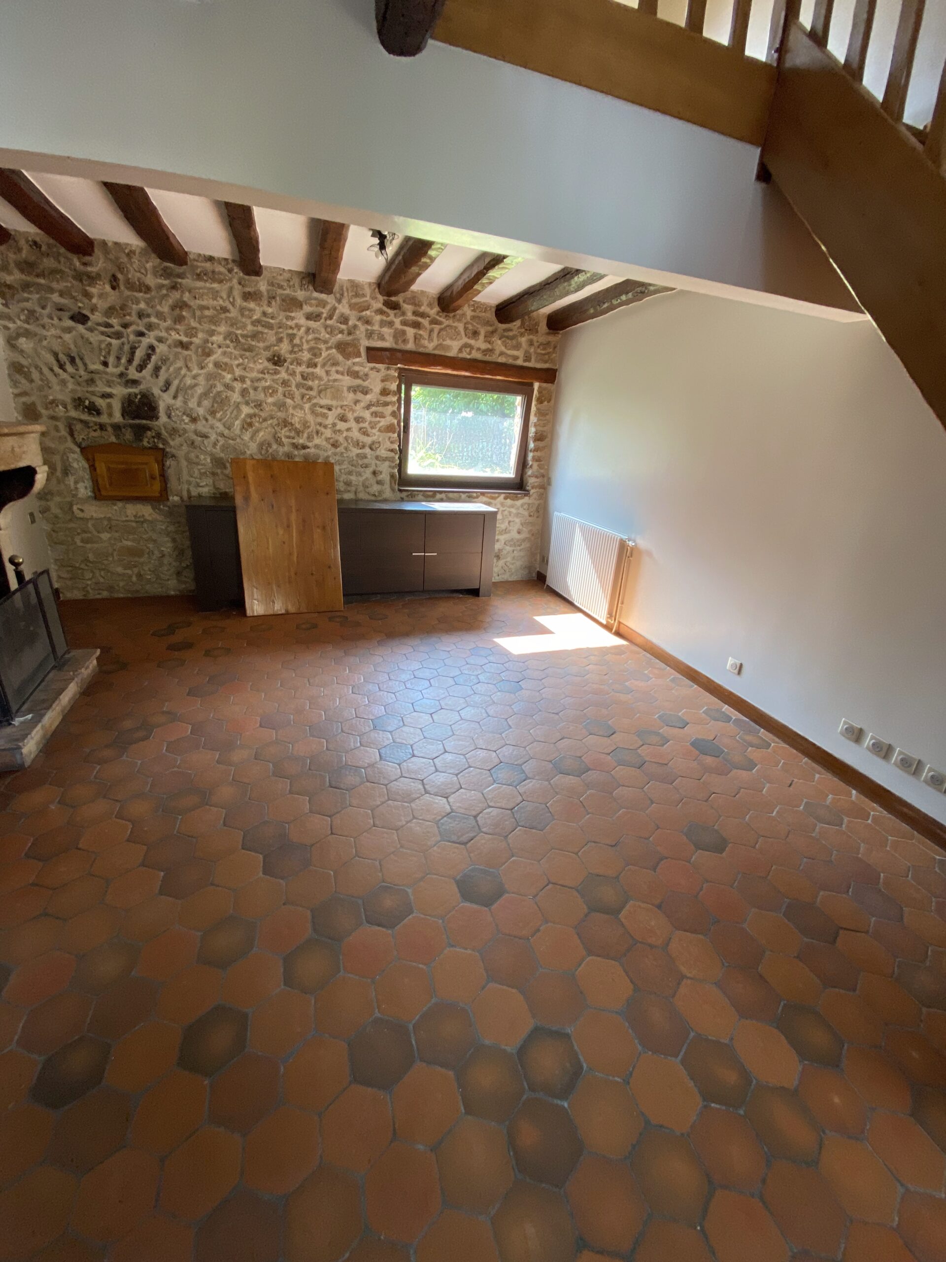 Nous avons mené une rénovation complète de cette maison individuelle ancienne située à Saint-Vrain (91770), en veillant à préserver son identité et son charme d’origine. Les murs en pierre apparente, les poutres en bois massif et les sols en terre cuite ont été soigneusement conservés et mis en valeur tout au long du chantier.